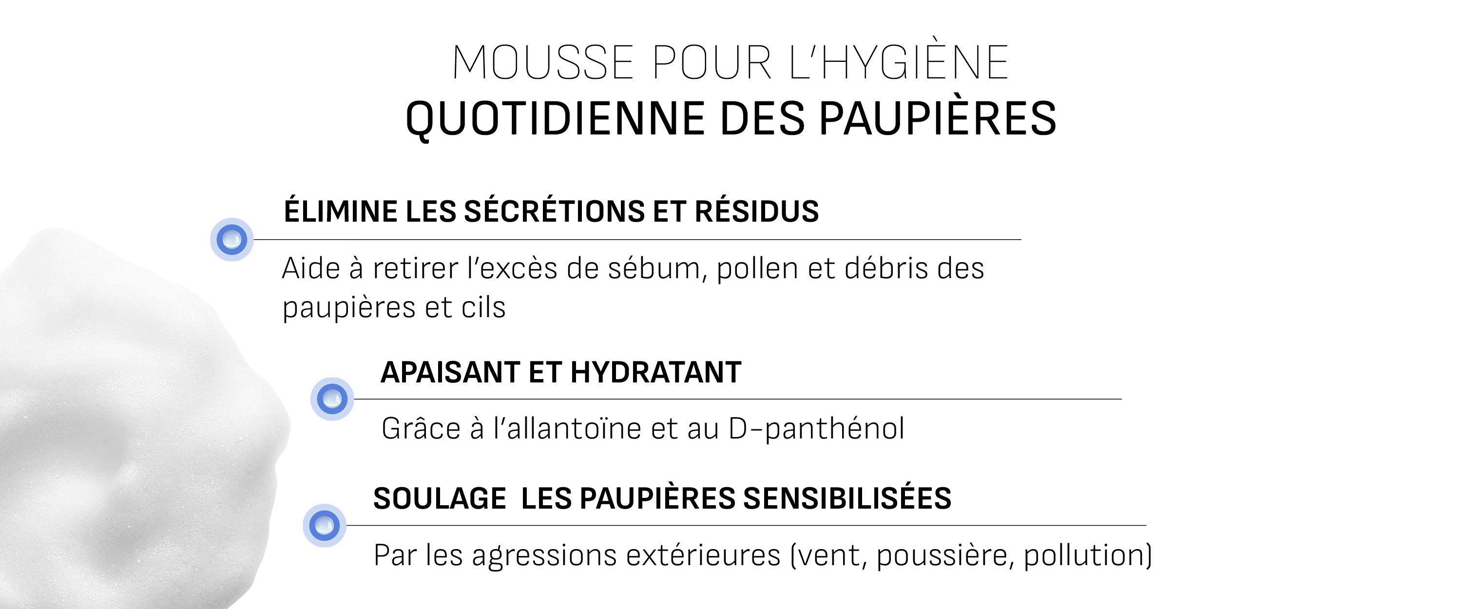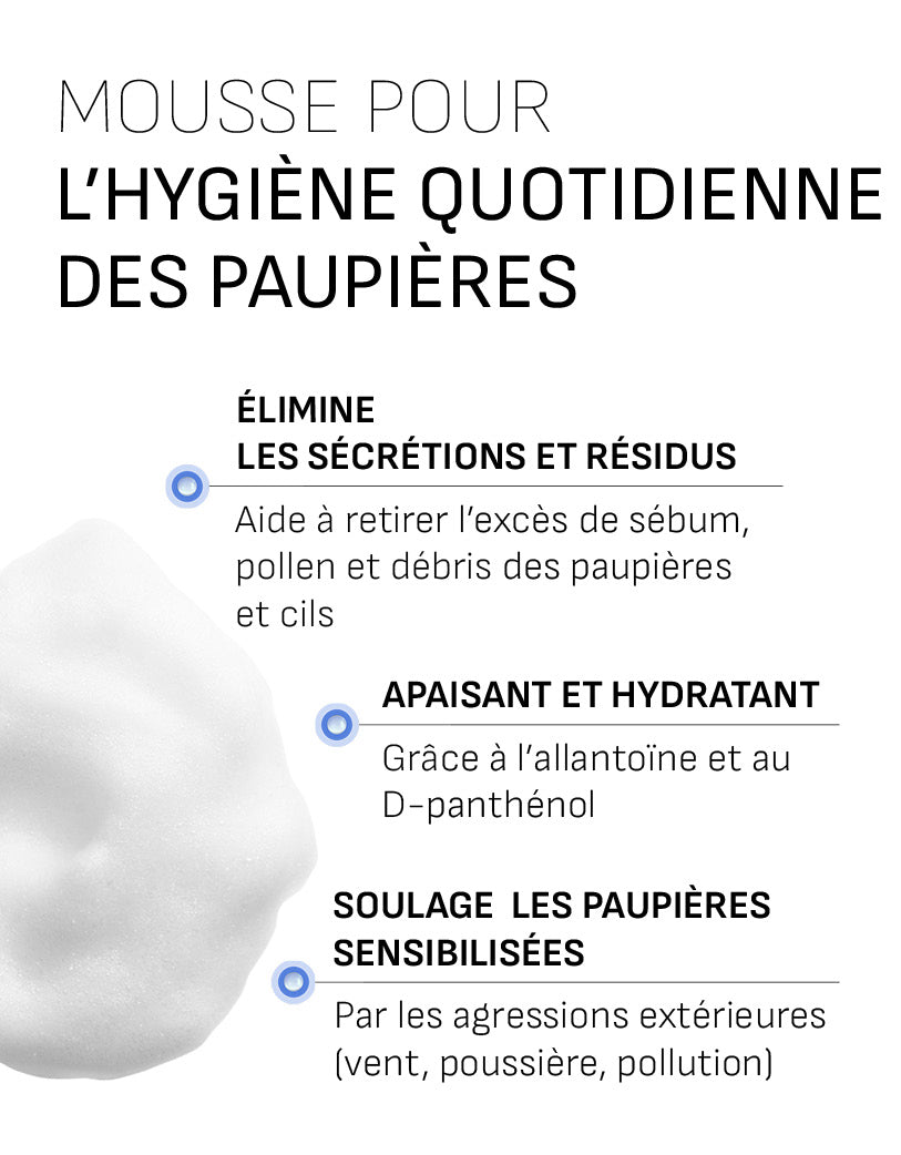 Toujours se laver les mains avant et après utilisation. Retirer les lentilles de contact avant utilisation de la mousse. S’assurer qu’il n’y ait pas de mousse résiduelle avant de replacer les lentilles. Garder les yeux fermés pendant l’application. Le produit doit être utilisé pour les paupières et les cils. Ne pas appliquer directement dans l’œil. À usage externe uniquement. Tenir hors de la vue et de la portée des enfants. Ne pas utiliser le produit chez l’enfant de moins de 6 ans. Pour les enfants de plus de 6 ans, l’application doit être effectuée par un adulte et uniquement après avis de votre spécialiste. En cas d’utilisation chez la femme enceinte ou allaitante, il est conseillé de consulter votre spécialiste au préalable. Durant l’utilisation, utiliser du maquillage hypoallergénique pour les yeux et des lotions pour peau sensible pour le contour des yeux. Ne pas utiliser en cas d’hypersensibilité spécifique à l’un des constituants. En cas de réaction, arrêter immédiatement l’utilisation, rincer vos yeux avec de l’eau et consulter votre médecin en cas de symptômes persistants. Jeter toute solution restante 6 mois après ouverture. Ne pas utiliser si le flacon est endommagé. Ne pas utiliser après la date de péremption.